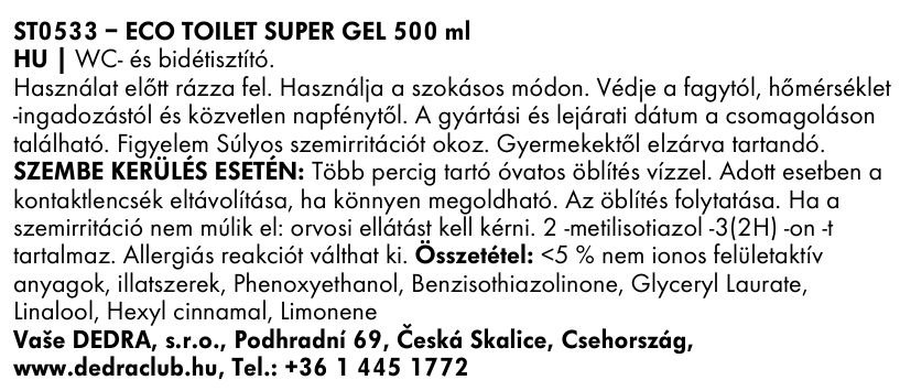 A SUPERGEL WC egy sűrű, eukaliptusz illatú öko gél, amely tisztítja a WC-ket, bidéket és piszoárokat. Ötvenszer több hatóanyagot tartalmaz vízkő és szennyeződések ellen. Az új generációs ECO tenzideknek köszönhetően akár három lehúzás után is hatékonyan működik. Őrleménye: 500 ml. Zuhanykabinokhoz is alkalmas.