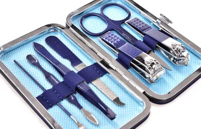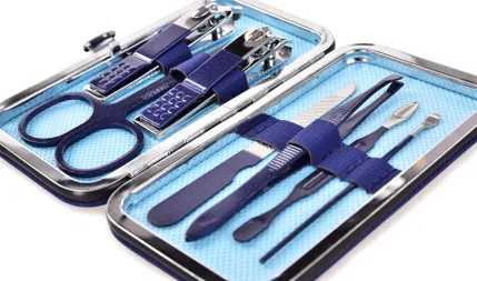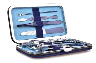 Rozsdamentes acélból készült manikűrkészlet, praktikus tokban csomagolva.