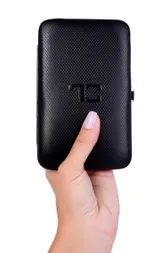 LUXUS MANIKŪR, 16 darabos piros készlet bronz bevonatos fekete acélból, zárható bőr tárolóban, FC logóval emboszolva.