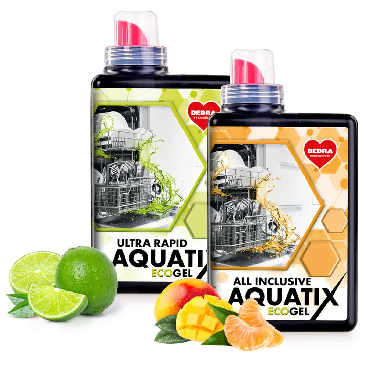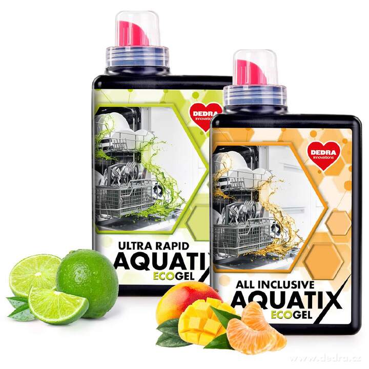 1+1 AQUATIX® ECOGEL mosogatógép szett: ULTRA RAPID + ALL INCLUSIVE. Megbízhatóan eltávolítja a zsírt és a rászáradt szennyeződéseket, csíkmentes fényt ad, és rövid programokkal is működik. Ultra Rapid - frissítő lime, All Inclusive - egzotikus mangó és mandarin.