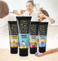 DEDRA DENT® SWEET & SMILE egy természetes gyermekfogkrém népszerű rágógumi ízben, amely a fogmosást örömteli rituálévá varázsolja. 100%-ban biztonságos a legkisebbeknek is – a krém nyugodtan lenyelhető, így ideális 6 hónapos kortól.