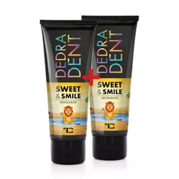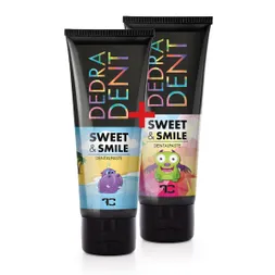 A DEDRA DENT® SWEET & SMILE 2 db-os szett – természetes gyermekfogkrém rágógumi ízben. 100%-ban biztonságos 6 hónapos kortól, hipoallergén, xilitollal a tejfogak védelmére. Nyugodtan lenyelhető.