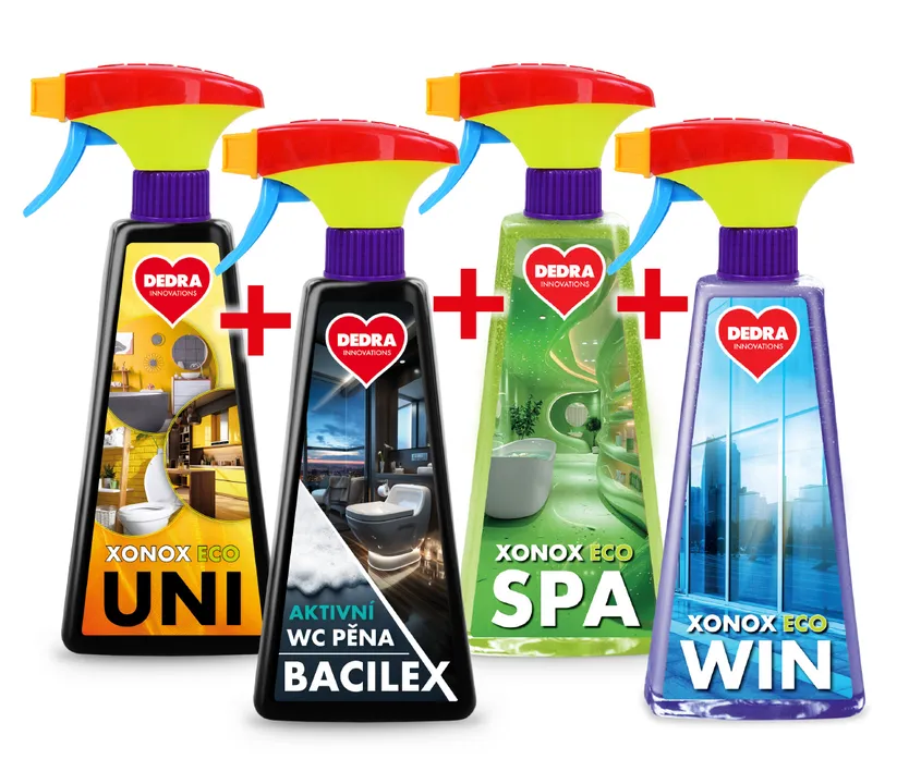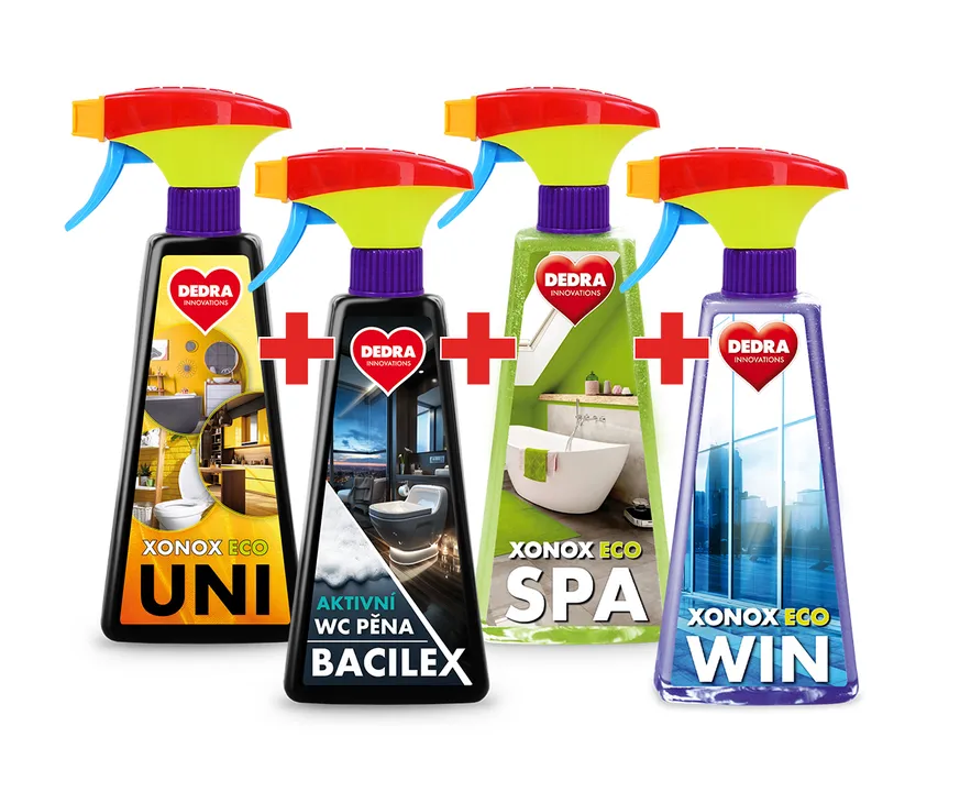 Teljes habtisztító szett: XONOX ECO UNI, BACILEX (WC hab), XONOX ECO SPA (vízlepergető hatás) + INGYENES XONOX ECO WIN (ablak- és tükörtisztító). Magas koncentrációjú, környezetbarát, Csehországban készült – a kompromisszumok nélküli tökéletesen tiszta otthonért.