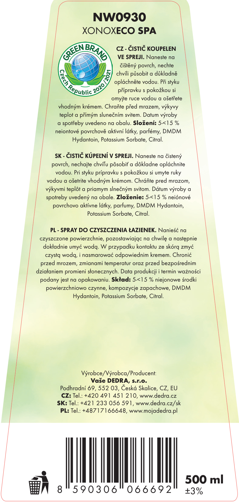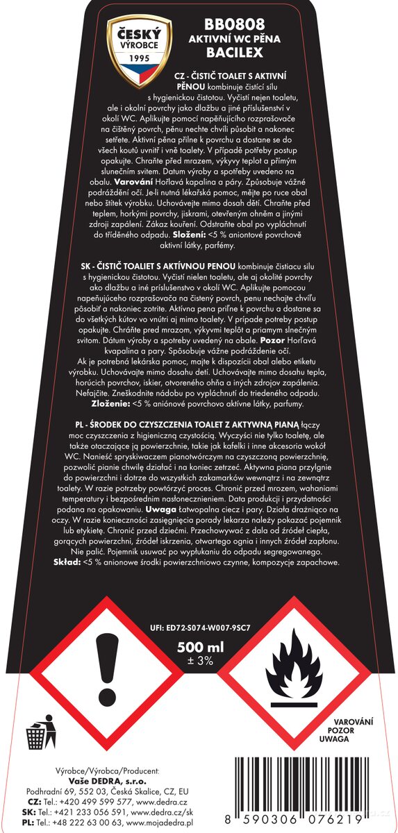 1x univerzális habos tisztítószer sima felületekre XONOX UNI eco, 500 ml + 1x aktív WC hab a mosdókagylókhoz, mosdókagylókhoz és a WC teljes területére BACILEX, 500 ml + 1x habos tisztítószer ablakokra, üvegekre és tükrökre XONOX ECO WIN, JUICY SUMMER illat, 500 ml + 1x habos fürdőszobai tisztítószer vízlepergető hatással XONOX ECO SPA, új mész, 500 ml.