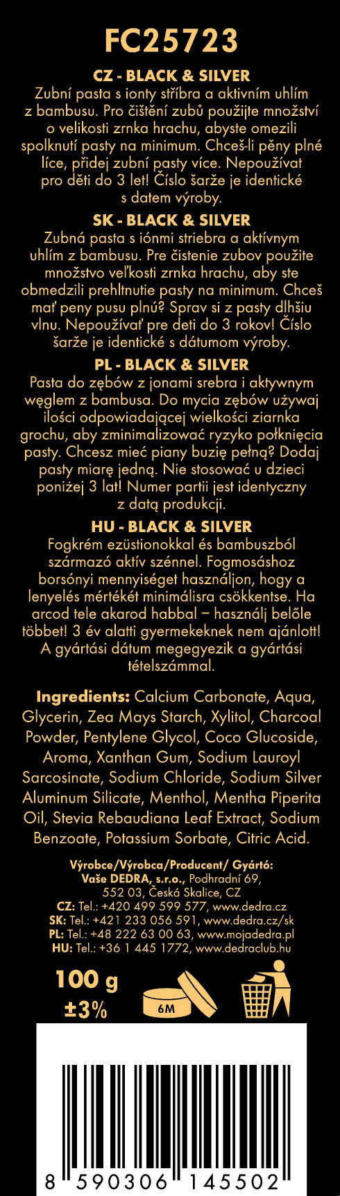 DEDRA DENT® BLACK & SILVER egy természetes fogkrém ezüstionokkal és bambuszaktív szénnel az antibakteriális védelemhez, kíméletes fehérítéshez és hosszú távú friss lehelethez. A borsmentaolaj és a mentol felfrissíti a szájat, a xilit és a stevia pedig cukormentes édesítést biztosít. SLS, SLES, fluoridok, parabének és triklozán nélkül. XXL kiszerelés 100 g a mindennapi fog- és ínyápolásért.