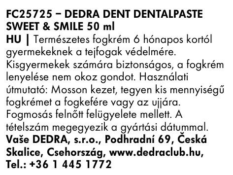 DEDRA DENT® SWEET & SMILE egy természetes gyermekfogkrém, mely a népszerű rágógumi ízével örömteli rituálévá varázsolja a fogmosást. 100% biztonságos még a legkisebbek számára is – a fogkrém nyugodtan lenyelhető, így ideális 6 hónapos kortól.