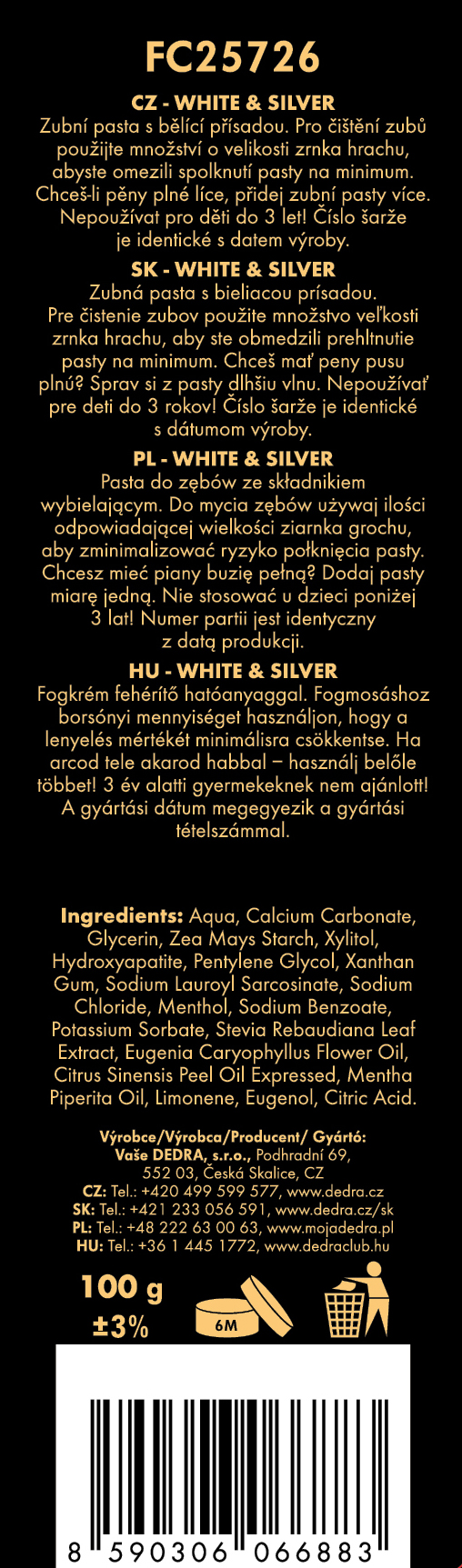 DEDRA DENT® WHITE & SILVER egy luxus természetes fehérítő fogkrém mindennapi kíméletes zubó- és ínyápoláshoz kifejlesztve. Az egyedülálló Omyadent® összetevőnek köszönhetően, természetes hidroxiapatittal és kalcium-karbonáttal helyreállítja a zománc természetes remineralizációját és erősíti annak ellenálló képességét. A finom fehérítő alap, amely mészből készült, kíméletesen eltávolítja a pigmentációt és a szennyeződéseket, anélkül hogy károsítaná a zománcot.