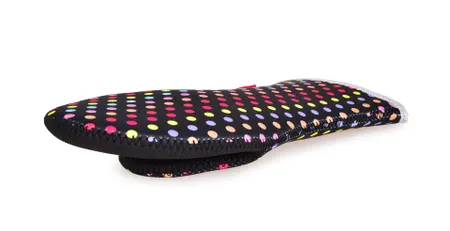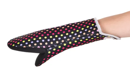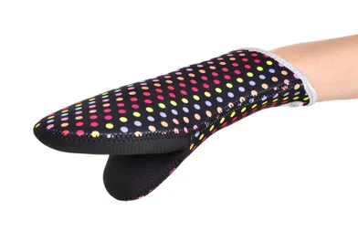 Állítható TERMOSÜTŐKESZTYŰ színes pöttyökkel. Uniszex bal és jobb kézre, csúszásmentes felület, hosszabb hossza védi az alkarodat is. 260 °C-ig hőálló, 30 °C-on mosható. Mérete 14 × 33 cm.