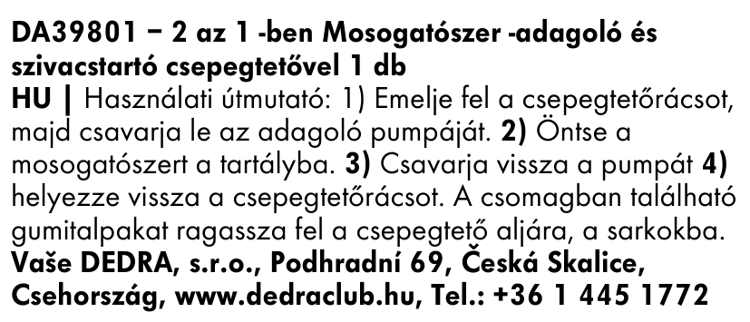 - 2 az 1-ben: adagoló + szivacstartó = hellyel való spórolás