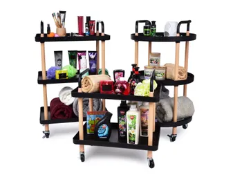 A gördülő polcos állvány MULTI-TROLLEY 4 kerékkel az alsó részén (mozgás ellen rögzíthető), erős fém fogantyúk a könnyű kezelhetőséghez, kerek 3 szintes. Méretek: átmérő 47,5 cm, magasság 86 cm (a polcok közötti magasság kb. 30 cm). Anyag: fém és műanyag.