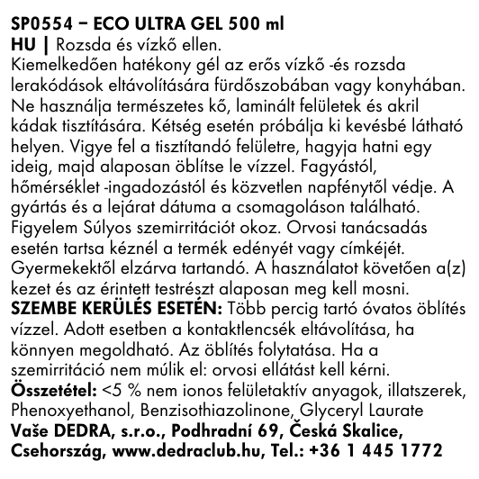 AZ ULTRAGEL egy extra sűrű tisztítószer, amely rendkívüli hatással van a vízkőre és a rozsdára. Nem csöpög, pontosan ott hat, ahol szükséges. Fürdőszobákhoz, konyhákhoz és csaptelepekhez egyaránt alkalmas. Űrtartalom 500 ml.