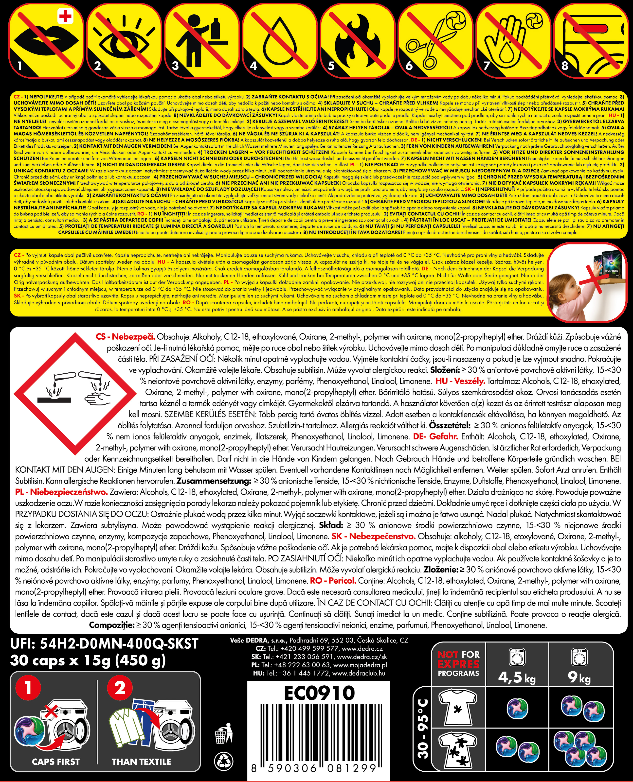 Koncentrált univerzális mosókapszula ECOSPHERE caps fehér és színes ruhákhoz. Hatékony 30 és 95 °C között, enzimekkel, optikai fehérítő nélkül és töltőanyagok nélkül. Biológiailag lebomló összetevő, intenzív gyümölcsös illat és a modern mosás kényelme.