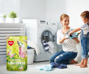 UNIVERSE ECORAPID egy univerzális mosószer fehér, világos és színes ruhákhoz. Az okos összetevőaktiváló rendszer felel meg a beállított hőmérsékletnek: