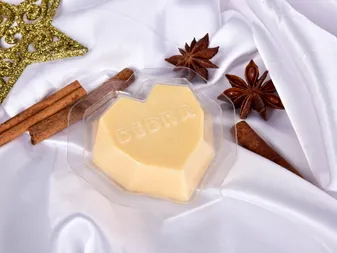 KÉZI KÉSZÍTÉS! 100% természetes termék, melegítés nélkül is illatozik, és tartalmaz minőségi prémium parfümöt mint az illatgyertyák. Vonzó csomagolásban kerül forgalomba, amely újrahasznosított kartonból készült.