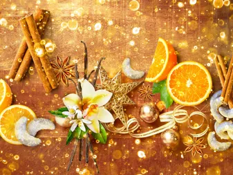 Csábító édes illat sült sütemények egy csipetnyi fahéj, Anizs és szegfűszeg mellett, finom vörös narancs és citrom fátyolfényével.