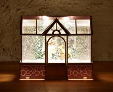 CSILLÁMOS ÜVEGHÁZ HÓPELYHEK | világító LED házikó dallammal és lebegő hópelyhekkel | 23 cm