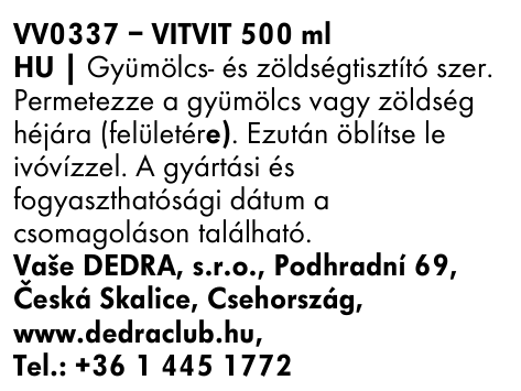 A VITVIT öko habszappan alaposan tisztítja a gyümölcsöt és zöldséget a paraffintól és a vegyi maradékoktól, amelyeket a víz önállóan nem távolít el. Nem hagy ízt. Térfogat: 500 ml.