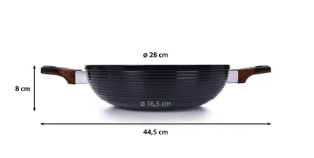 BIOPAN® WOODOO WOK serpenyő, 28 cm átmérővel, üvegfedővel, két fogantyúval a könnyű szállításhoz, 3600 ml űrtartalom, 8 cm magasság.