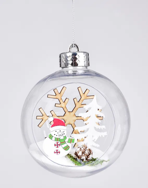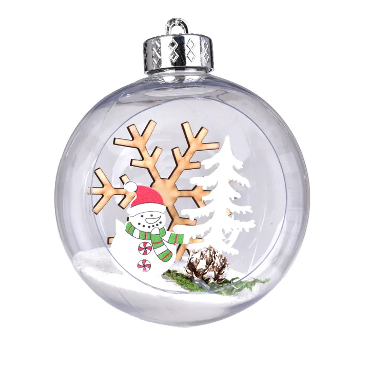 2 extra nagy átlátszó gömb szett (10 cm) részletes téli jelenettel belsejében – hóember, karácsonyfa, toboz és fa hópehely. Gyönyörű dísz, amely mesebeli hangulatot ad a karácsonyfának.