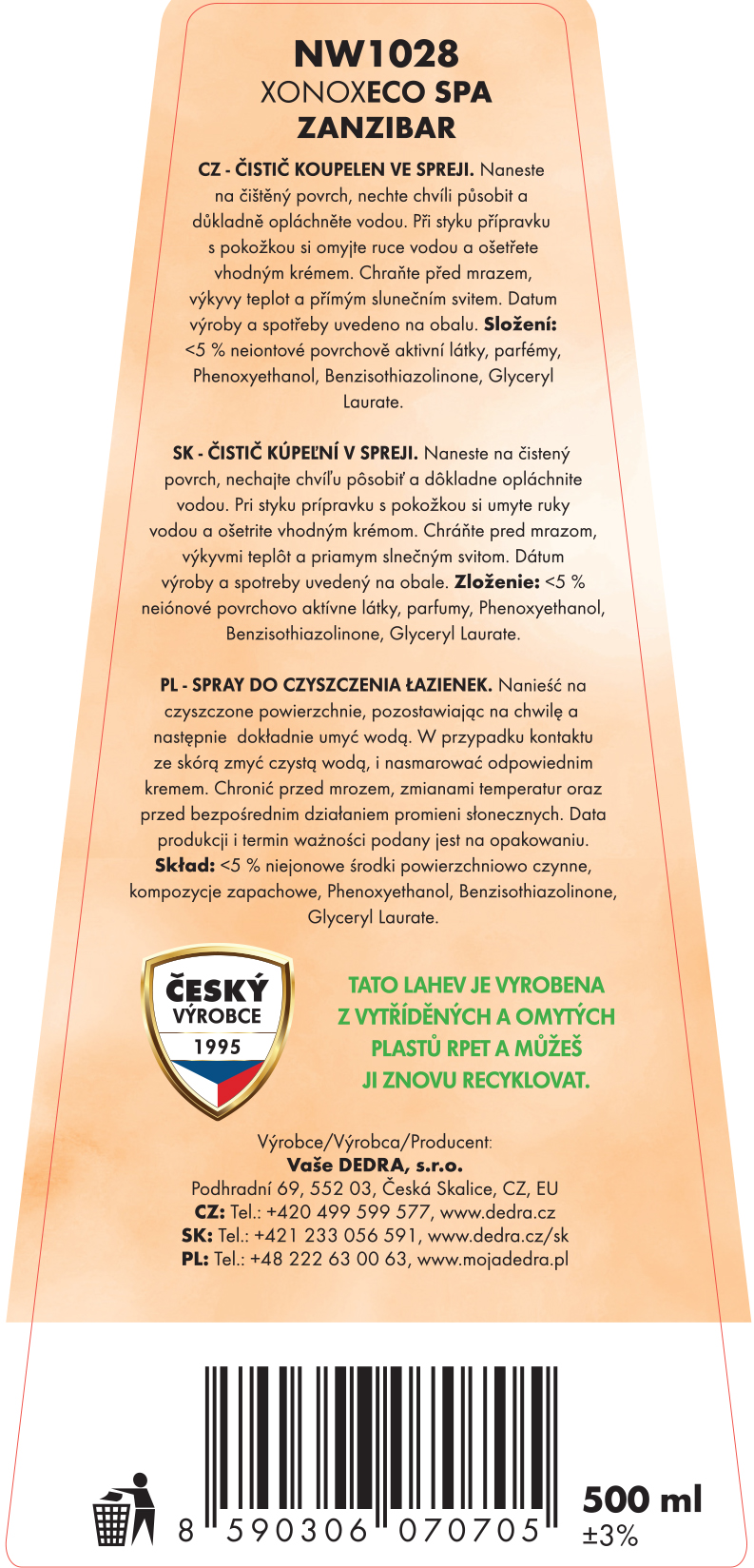 Az ECO fürdőszoba tisztító XONOX SPA ZANZIBAR illattal eltávolítja a vízkövet, a rozsdát és a szappan maradványokat. A védőfilm taszítja a vizet, így a fürdőszoba tovább fényes marad. Az intenzív illatosítás egzotikus SPA légkört teremt. Ideális kerámia, üveg és csempe tisztítására. Űrtartalom: 500 ml.