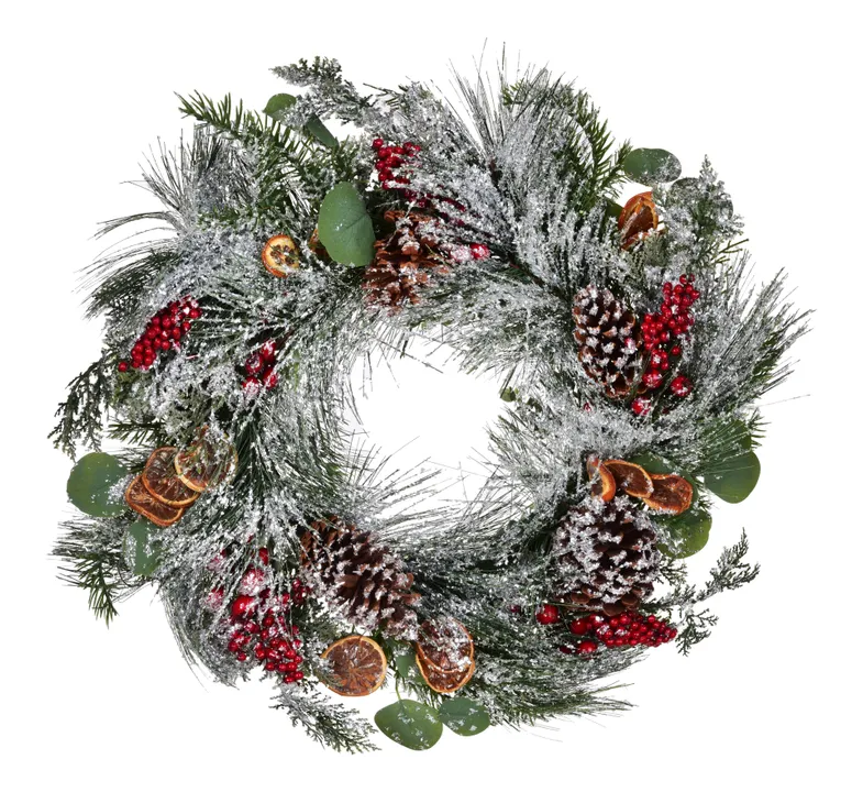 Varázsolj téli természetet az otthonodba. Ez a téli koszorú tobozokkal és gyümölcsökkel, természetes árnyalatokban hordozza az erdő nyugalmát és a hűvös reggel illatát. A havas ágacskák, piros bogyók, tobozok és szárított narancsszeletek harmonikus kompozíciót alkotnak, amely felpörgeti az ajtókat, a kandallópárkányt és az ünnepi asztalt. XXL-es, 50 cm átmérőjével igazán monumentális hatást kelt. Tovább díszítheted finom LED világítással.