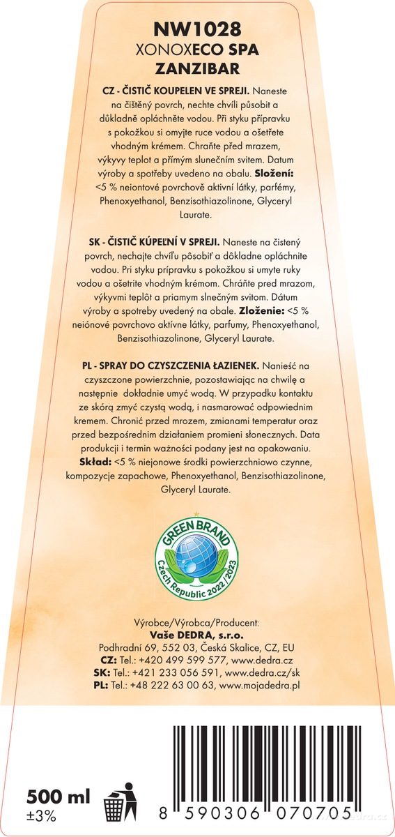 A ZANZIBAR szett tartalma: 1 x öblítő kondicionáló 750 ml + 1 x ECOultra AQUATIX® mosogatószer koncentrátum 500 ml + 1 x XONOX ECO SPA habfürdő tisztítószer 500 ml + 1 x ZANZIBAR, PARFUMIA®, 55 ml + 1x 5 db XL szivacs.