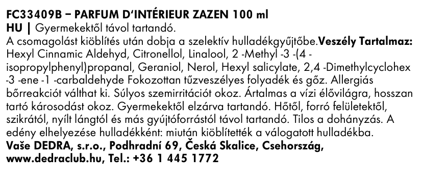 Azonnali hatású lakásparfüm. A HOZZÁADOTT VÍZ NÉLKÜLI összetételének köszönhetően illatosítja lakását, irodáját, gardróbját vagy autóját, mindezt VÍZCSEPPEK NÉLKÜL. A ZAZEN harmonizáló friss, zamatos parfüm virágos jegyekkel és pézsma alapjegyekkel. A vonzó csomagolás aranyozott dombornyomással.