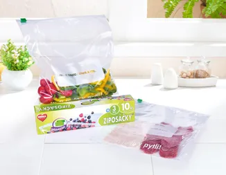 ZIPOSÁČKY® – 10 db-os, újrahasználható zip-es tasak (3 L) élelmiszerek tárolásához és fagyasztásához. A légmentes zárás segít, hogy a hús, gyümölcs, zöldség vagy péksütemény hosszabb ideig friss maradjon. Tartalmaz egy megjegyzés mezőt a tartalom és a dátum számára. Praktikusak az útközbeni uzsonnákhoz is.